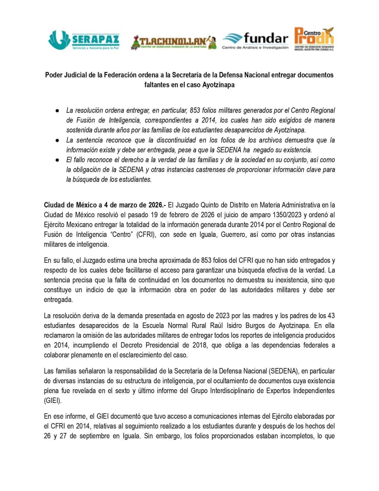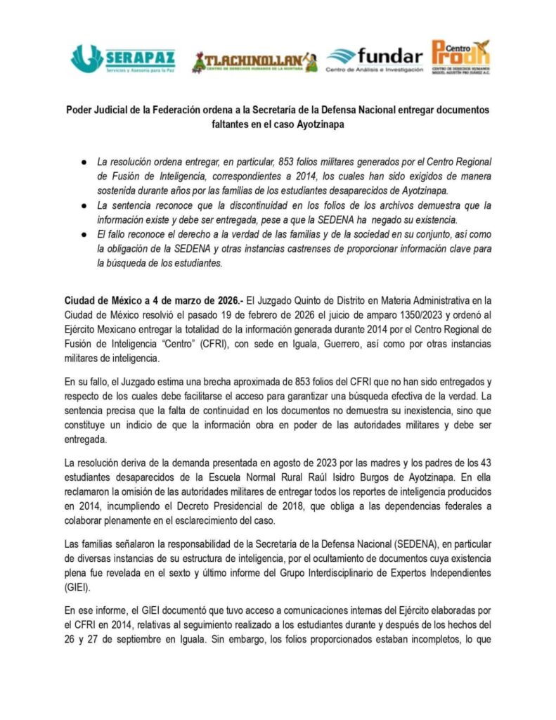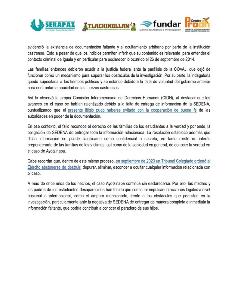Las organizaciones civiles SERAPAZ, Tlachinollan, Fundar y el Centro Prodh, que acompañan legalmente a las familias, destacaron que la sentencia reconoce formalmente la existencia de una brecha de aproximadamente 853 folios de inteligencia que la Secretaría de la Defensa Nacional (SEDENA) había negado sistemáticamente.