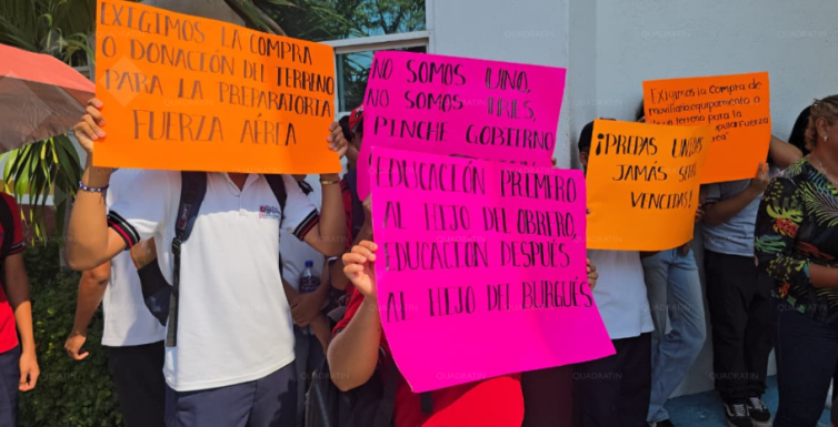 Acapulco, Gro., 16 de abril de 2026.- Padres de familia, estudiantes y docentes de la preparatoria popular Fuerza Aérea se manifestaron este jueves afuera del Palacio Federal, en este puerto, para solicitar apoyo en la adquisición o donación de un terreno donde puedan construir sus propias instalaciones.