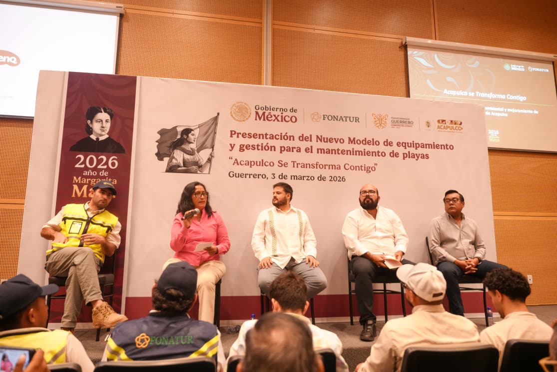 Acapulco, Gro., 03 de marzo de 2026.- El puerto inicia una etapa histórica en la gestión de su litoral con la presentación del Nuevo Modelo de Equipamiento y Mantenimiento de Playas “Acapulco se Transforma Contigo”, iniciativa del Gobierno de México a través del Fondo Nacional de Fomento al Turismo (Fonatur), organismo encargado de impulsar el desarrollo turístico en el país, que garantiza conservación, ordenamiento y desarrollo integral y representa un logro impulsado por la presidenta Abelina López Rodríguez, quien destacó la aplicación completa de los recursos, la limpieza permanente, accesos dignos y proyectos sostenibles.